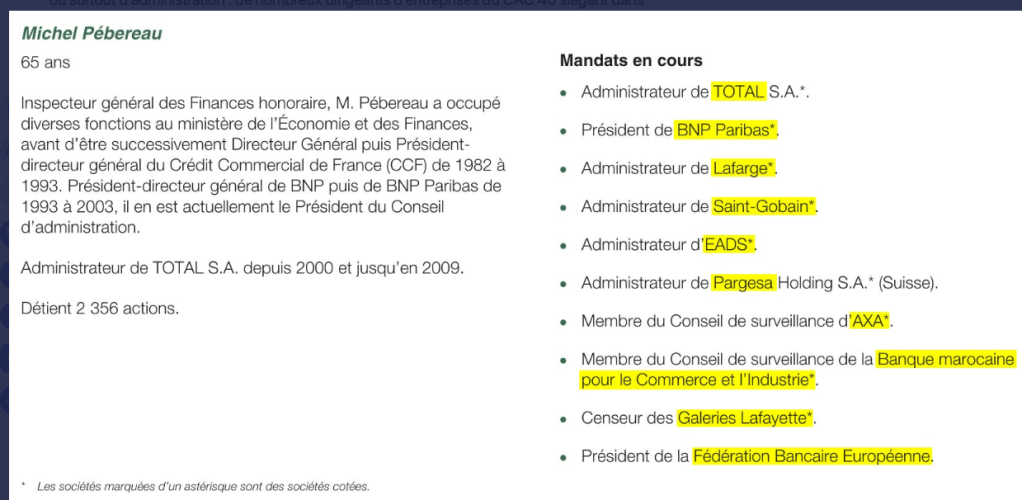 « Le CAC 40 se caractérise aussi par un degré particulièrement élevé de solidarité entre ses membres. Sa diversité économique a pour pendant une forte cohésion d’un point de vue stratégique et politique. […] Ses dirigeants savent aussi se serrer les coudes face aux politiques et face aux critiques. Cette solidarité est organisée à travers des organisations thématiques ou bien des organisations de lobbying comme le Medef et surtout l’AFEP, Association française des entreprises privées. […] S’y ajoutent les liens personnels entretenus dans les cercles de sociabilité des élites (Le Siècle, le Jockey et autres) et favorisés par le recrutement dans les mêmes grandes écoles, viviers de dirigeants du public comme du privé. »