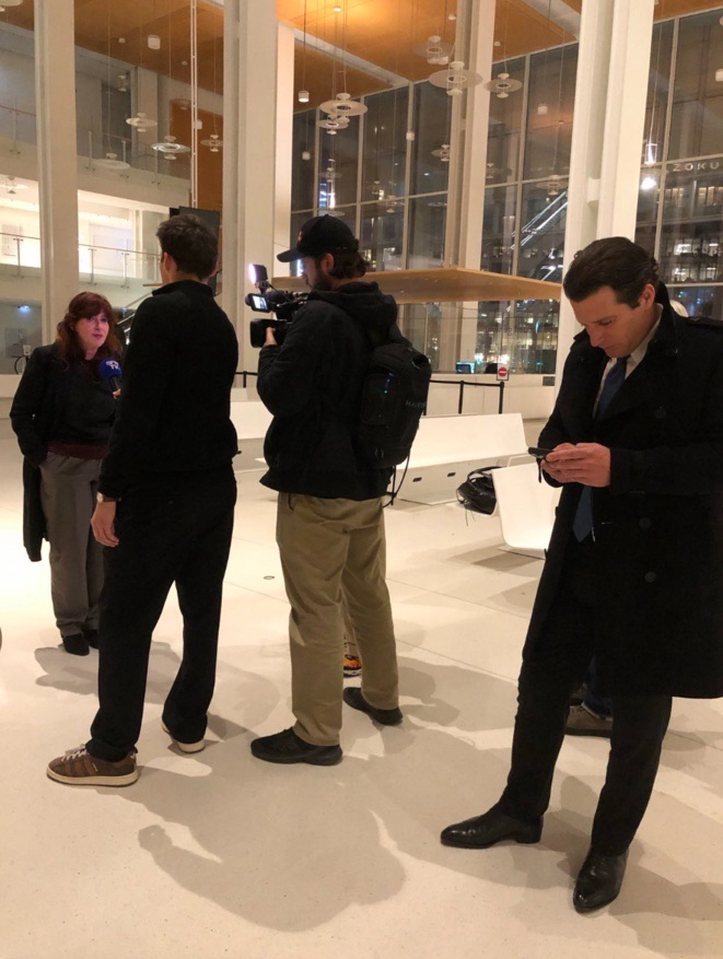 À deux reprises, lorsque celle-ci et sa consœur ont réagi auprès de chaînes télévisées dans le hall du tribunal, il s’est posté juste à côté d’elles pour écouter et répliquer (voir aussi les images de France 5 à 00 min 18).