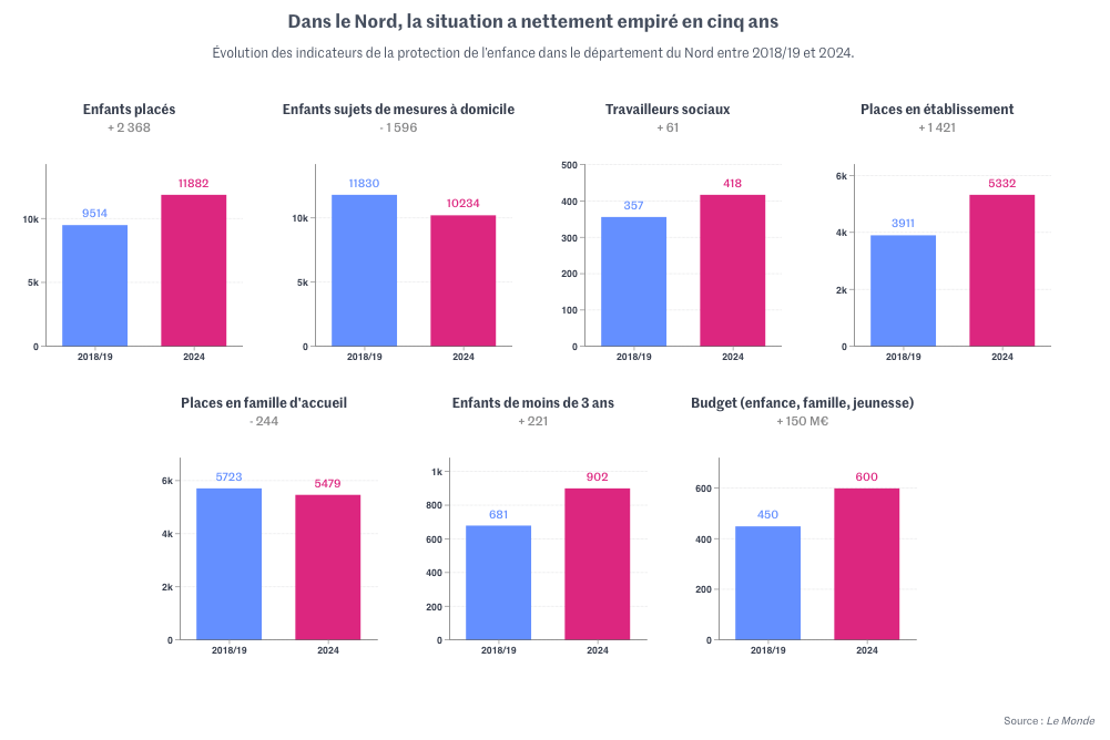 Si le Nord est sous tension, c’est qu’il est en première ligne dans la protection de l’enfance, compétence confiée aux départements depuis les lois Defferre de décentralisation de 1982. Un chiffre résume la gravité de la situation et l’ampleur de la mission assignée aux collectivités : au 31 décembre 2024, dans le Nord, 22 116 enfants étaient pris en charge par les services sociaux. C’est autant que d’habitants dans des villes moyennes du département comme Loos ou Hazebrouck.