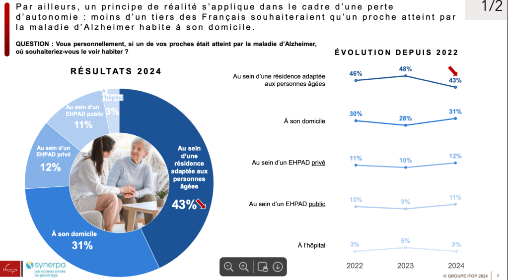 - Par ailleurs, un principe de réalité s’applique dans le cadre d’une perte d’autonomie : moins d’un tiers des Français souhaiteraient qu’un proche atteint par la maladie d’Alzheimer habite à son domicile (31%).