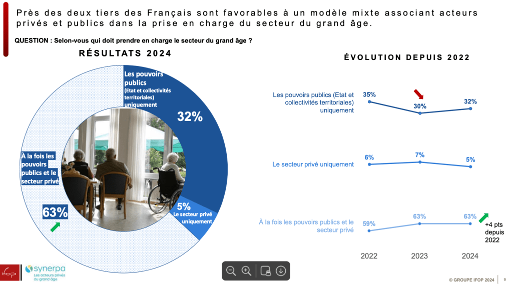 - Près des deux tiers des Français sont favorables à un modèle mixte associant acteurs privés et publics dans la prise en charge du secteur du grand âge (63%, +4 points depuis 2022).