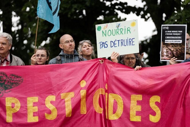 Rassemblement contre la loi « Duplomb » près de l’Assemblée nationale, le 27 mai 2025. © Photo Gauthier Bedrignans / Hans Lucas via AFP
