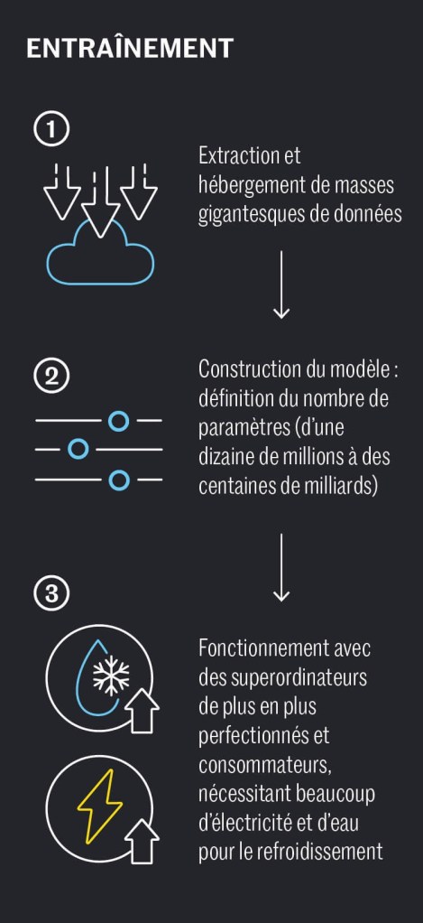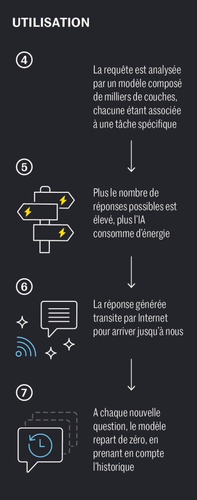 Mais alors pourquoi l’IA générative est-elle davantage énergivore que les technologies grand public que nous utilisions jusqu’alors ? Pour y répondre, il faut d’abord comprendre les deux phases du fonctionnement de ces robots : l’entraînement du modèle, puis l’inférence, c’est-à-dire son utilisation au quotidien.