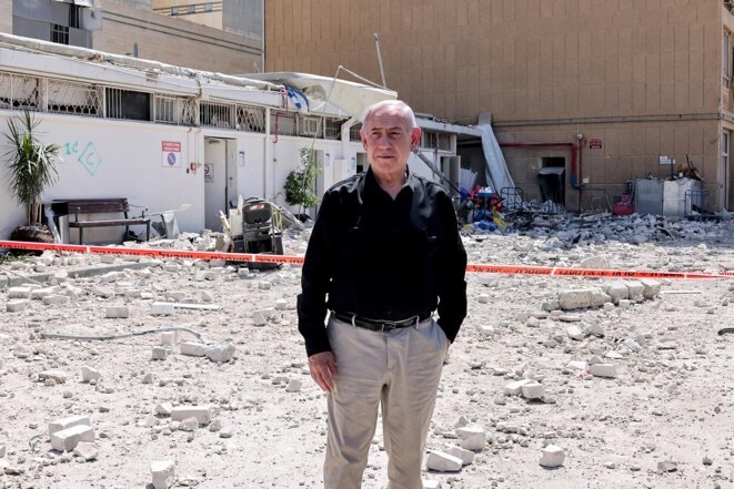 Benyamin Nétanyahou au milieu des débris devant l’hôpital Soroka de Beersheba, après qu’il a été touché par un missile tiré depuis l’Iran le 19 juin 2025. © Photo Marc Israel Sellem / Pool / AFP