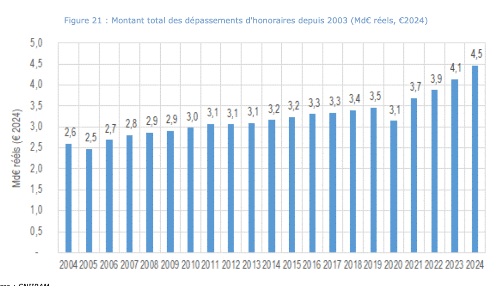 Le montant total des dépassements d’honoraires facturés par les médecins a atteint 4.5 milliards d’euros en 2024, soit une hausse de 7% par an depuis 2021, relève la Cnam dans son rapport Charges et produits pour 2026.