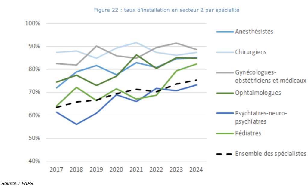 En outre, les taux d’installation en secteur 2 « restent élevés et ont globalement augmenté », rapporte la caisse : 74% des nouvelles installations se sont faites en secteur 2 en 2024, contre 64% en 2017. Toutes sécialités confondues, 56% des spécialistes exercent désormais en secteur 2, contre 37% en 2000.