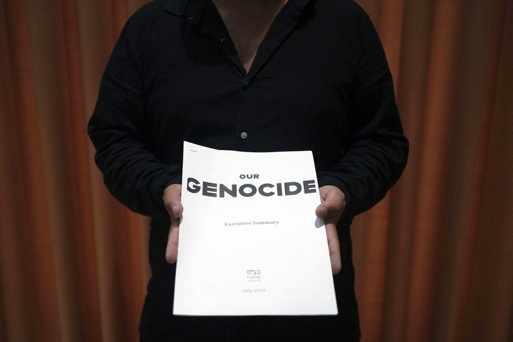 Une copie de « Notre génocide », un rapport de B’Tselem et de PHRI, qualifiant la guerre à Gaza de génocide, à Jérusalem, le 28 juillet 2025. © Photo Maya Alleruzzo / AP