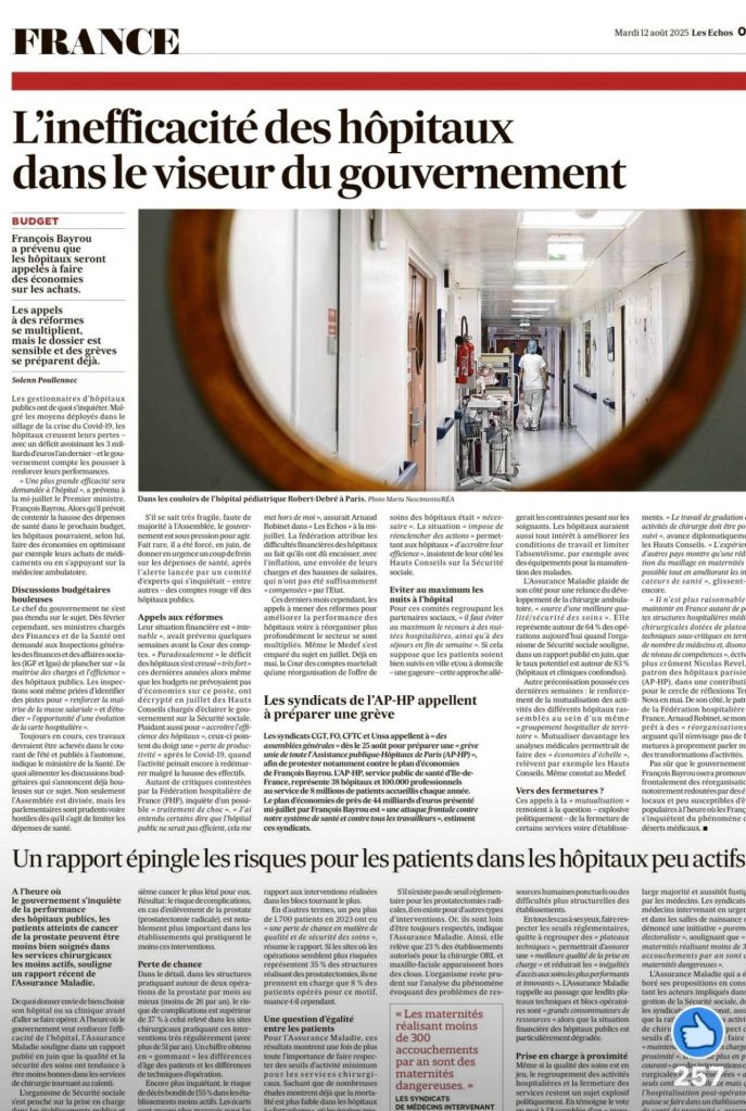 Ces derniers mois, les appels à mener des réformes pour améliorer la performance des hôpitaux se sont multipliés, souligne le journal. Pointant la « baisse apparente de la productivité » des hôpitaux et la « dégradation inédite de [leur] situation financière », dans un rapport publié début juillet, le Haut Conseil pour l’avenir de l’assurance maladie (Hcaam), le Haut Conseil du financement de la protection sociale (HCFiPS) et le Haut Conseil de la famille, de l’enfance et de l’âge (HCFEA) ont ainsi jugé que la situation imposait de « réenclencher des actions permettant aux établissements de santé d’accroître leur efficience ».