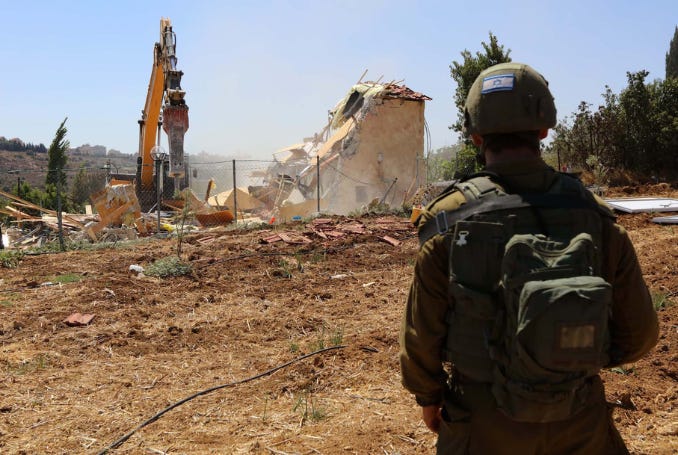 Israeli soldiers demolish a Palestinian building in the so-called Area C, in the occupied West Bank. Photo: credit: WAFA