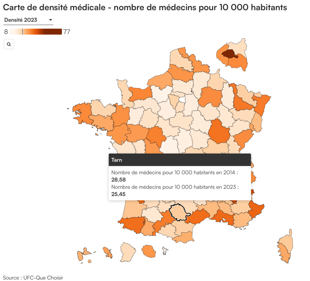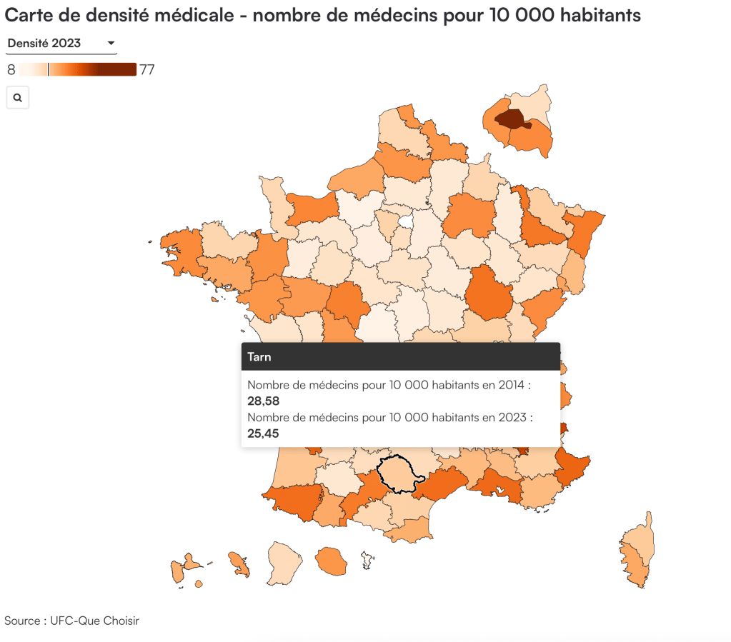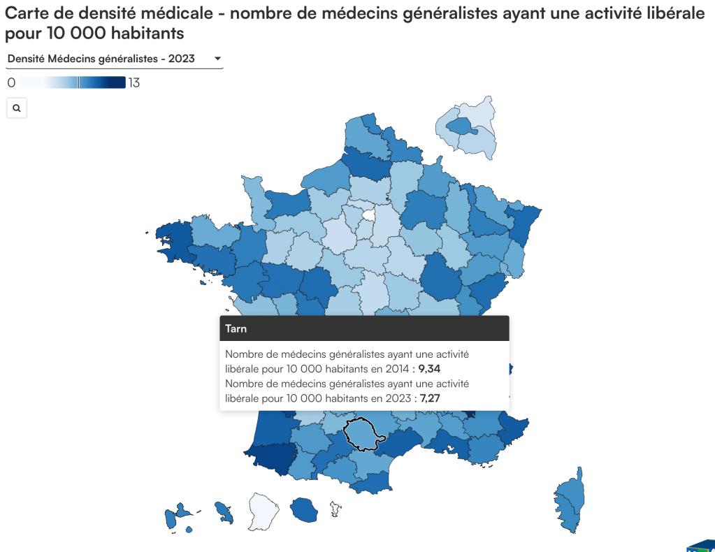 - Par exemple, en 2023, la densité médicale dans l’Eure ou l’Ain est respectivement de 15,7 et 15,9 médecins pour 10 000 habitants (ce chiffre descend même à 8 à Mayotte), contre 42,9 dans le Rhône, 45,7 en Hautes-Alpes, et même 76,8 à Paris.