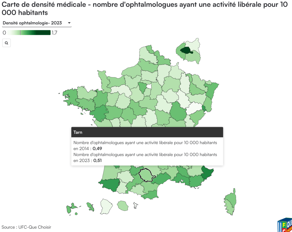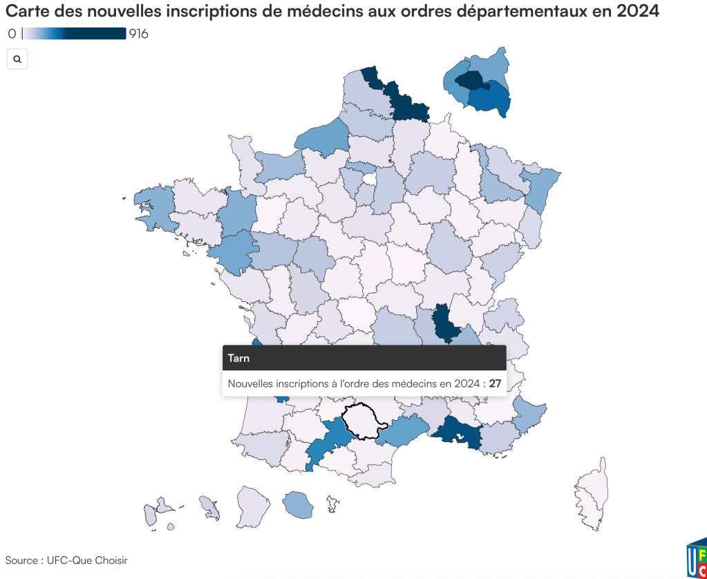 « Trois quarts des départements ont vu leur situation se détériorer en 10 ans » avec une baisse de la densité de médecins installés, rapporte l’UFC-Que Choisir, qui met en avant des départements comme l’Ain ou l’Eure.