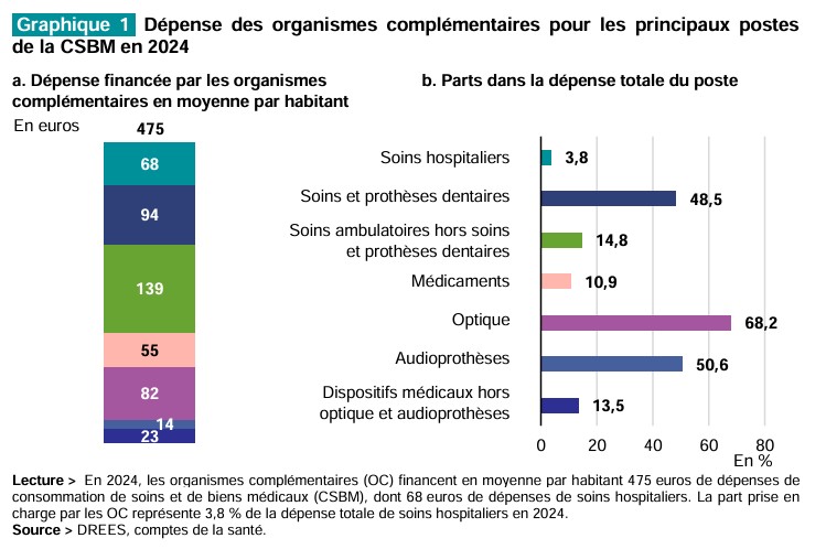 En corollaire de cette évolution, la part des dépenses de santé financées par les organismes complémentaires (12.8%) augmente pour la deuxième année consécutive. Les remboursements des mutuelles, assurances et instituts de prévoyance sont tirés notamment par les dépenses en dentaire (+0.5 milliard d’euros) et autres soins ambulatoires (+0.7 milliard d’euros).
