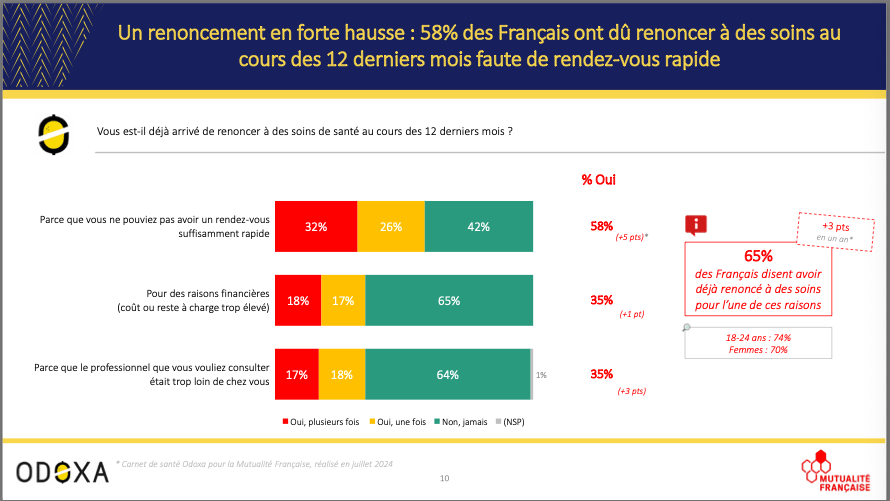 65% des Français déclarent avoir dû renoncer à des soins de santé au cours des 12 derniers mois, soit 3 points de plus qu’en 2024. Majoritairement en raison du délai d’obtention d’un rendez-vous (58%) avec un taux en hausse de 5 points par rapport en 2024, puis pour des raisons financières ou d’éloignement du professionnel de santé à consulter (35%). La part de ce dernier motif a fortement a augmenté depuis 2017 où il s’élevait à 25%