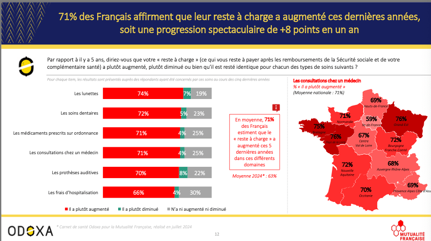 71% des Français affirment que leur reste à charge a augmenté ces dernières années, soit une progression spectaculaire de 8 points en un an. Et l’avenir ne rassure pas : 91% anticipent une nouvelle hausse, soit +31 points en 4 ans.