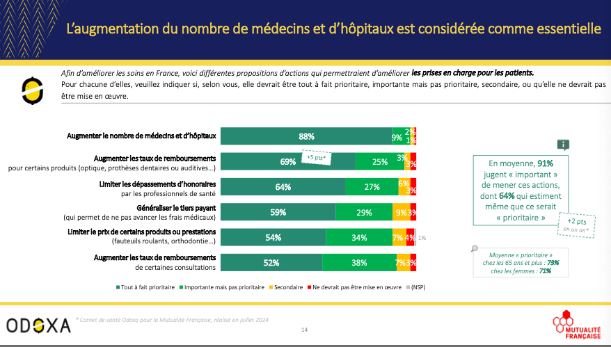 88% souhaitent augmenter le nombre de médecins et d’Hôpitaux, 64% sont pour limiter les dépassements d’honoraires et 59% pour généraliser le tiers payant