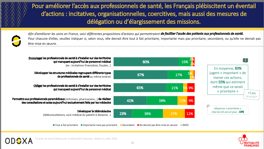 80% des Français estiment tout à fait prioritaire d’encourager les professionnels de santé à s’installer dans les territoires où il en manque, une proportion en hausse de 3 points en un an.