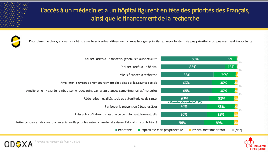 89% souhaitent faciliter l’accès à un médecin généraliste ou spécialiste, 83% l’accès à l’Hôpital. 66 et 65% mieux rembourser les soins par la sécurité sociale et les complémentaires