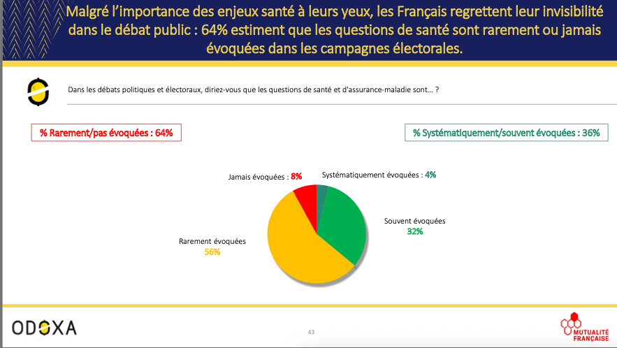 Malgré l’importance des enjeux santé à leurs yeux, les Français regrettent leur invisibilité dans le débat public : 64% estiment que les questions de santé sont rarement ou jamais évoquées dans les campagnes électorales.