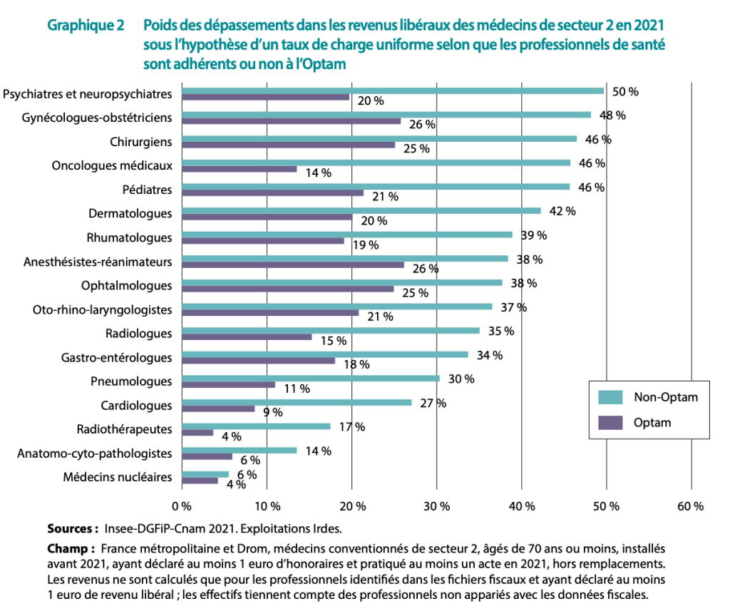Évidemment, les écarts sont marqués entre les médecins adhérents à l’Optam et les non-Optam, le poids des dépassements dans le revenu libéral étant sensiblement plus élevé pour les non-Optam, et ce, quelle que soit la spécialité (Graphique 2).