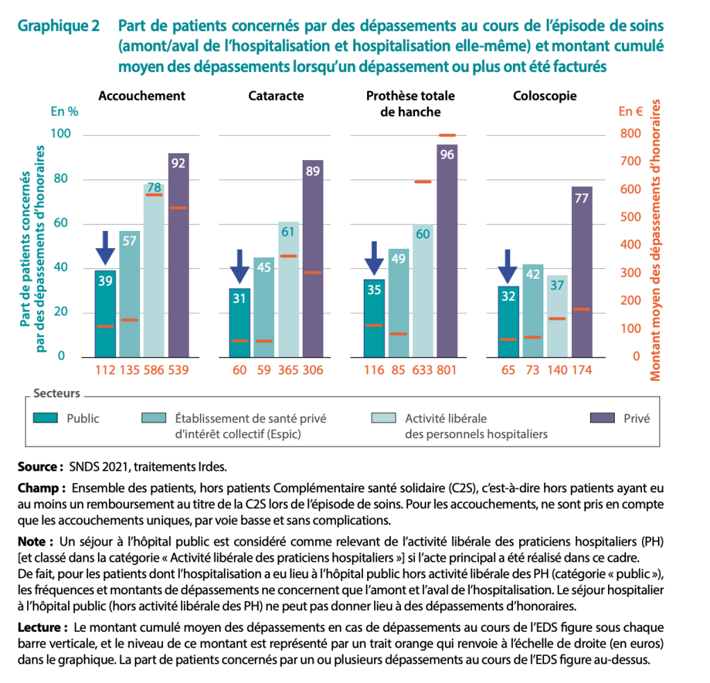 En cas d’hospitalisation dans le privé, la probabilité de payer un dépassement d’honoraires sur l’acte principal est élevée : 46 % pour l’accouchement, 71 % pour la cataracte, 87 % pour la prothèse totale de hanche et 34 % pour la coloscopie. A contrario, cette probabilité est, de fait, nulle dans le public, sauf lorsque la prise en charge relève de l’activité libérale du praticien hospitalier.