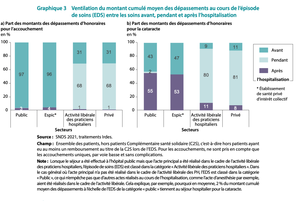 Des dépassements très fréquents (90% ou plus) pour les patients hospitalisés dans le secteur privé, mais qui existent aussi en amont et en aval de l’hospitalisation pour les patients hospitalisés dans le secteur public