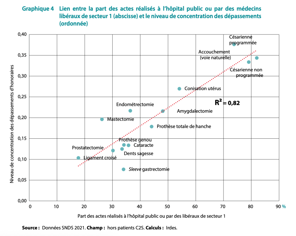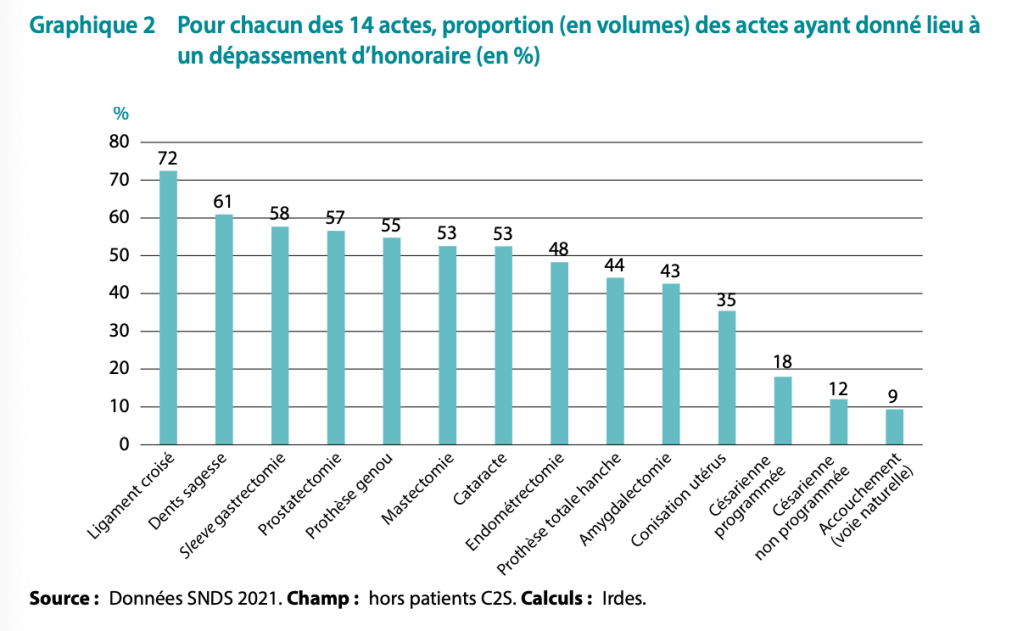 l’importance des dépassements est très variable selon les actes. Par exemple, seuls 10 % des accouchements par voie naturelle font l’objet de dépassements d’honoraires, alors que ceux-ci concernent 70 % des opérations des ligaments croisés : les dépassements sont donc sept fois plus fréquents dans ce second cas.