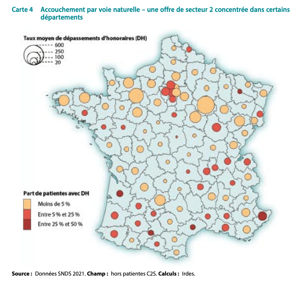 Les dépassements sont d’autant plus concentrés chez les plus favorisés que l’offre de secteur 2 se concentre dans les départements les plus riches Selon les actes, la pratique des dépassements d’honoraires peut être répandue sur l’ensemble du territoire, ou au contraire concentrée dans certains départements. Par exemple, pour l’accouchement par voie naturelle, les dépassements sont rares (seulement 10 % des actes donnent lieu à dépassement, Tableau 2) et dans un nombre élevé de départements, cet acte est pratiqué sans dépassement (Carte 4).