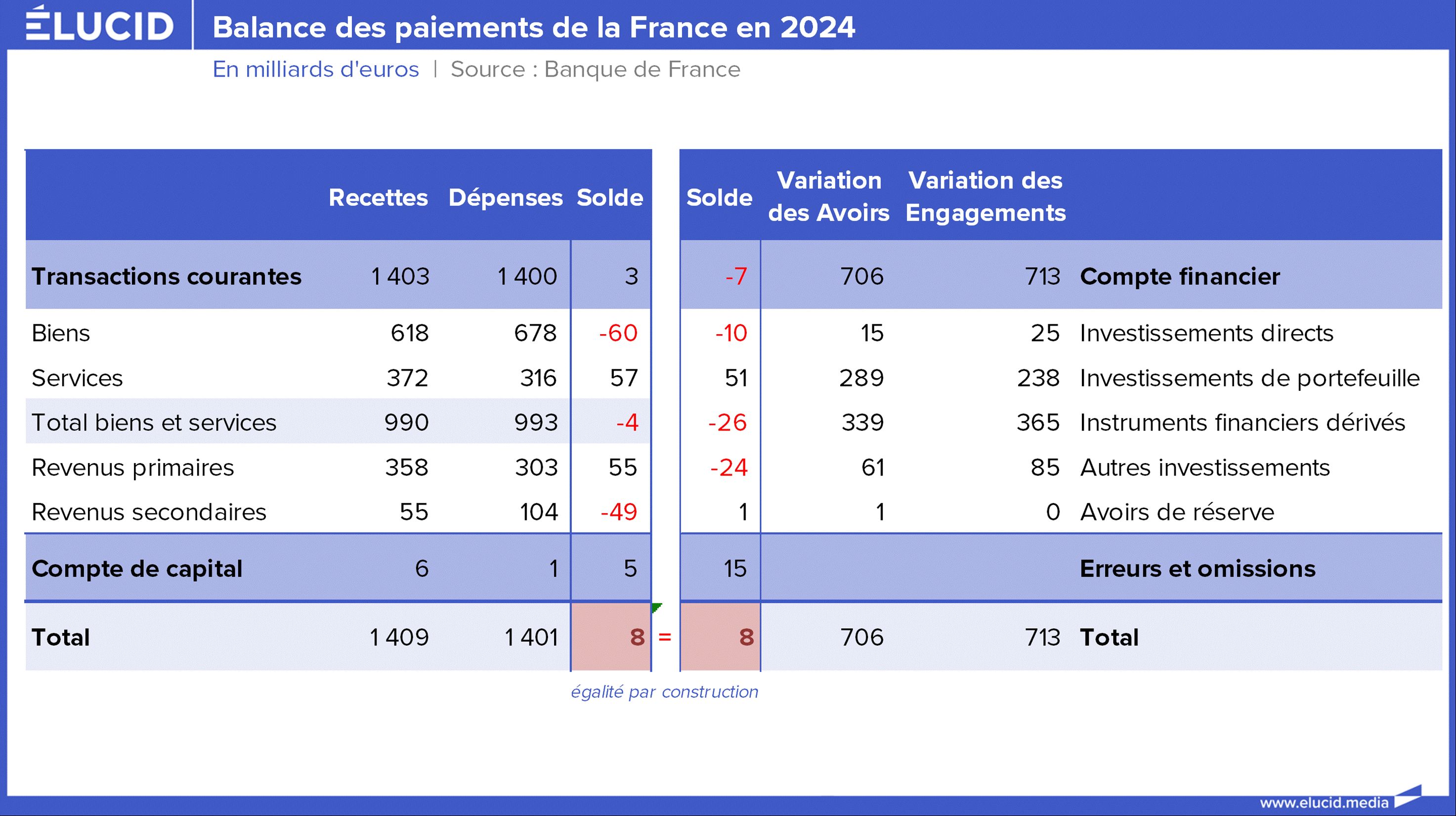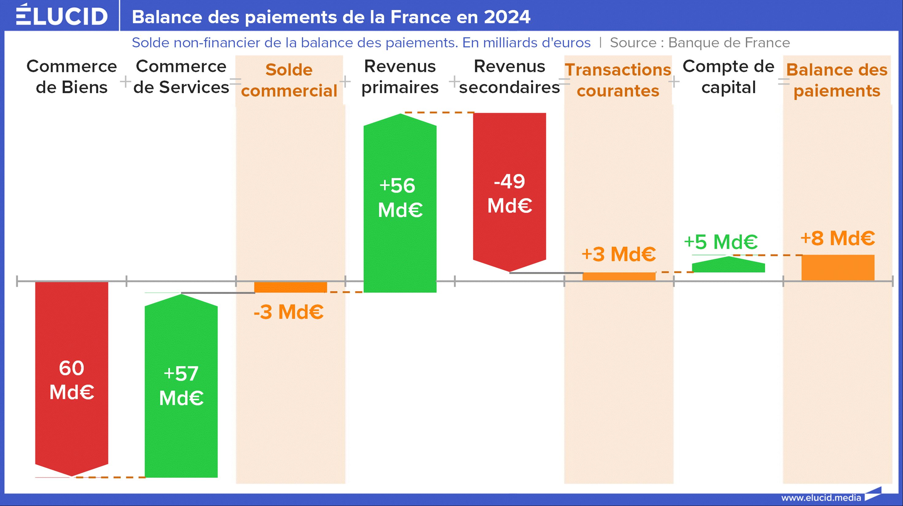 Selon la balance des paiements de la France pour l’année 2024 (établie par la Banque de France), la partie non financière affiche un solde quasi nul de +8 Md€ (+3 Md€ au titre des transactions courantes et +5 Md€ de transferts de capitaux), tandis que le solde financier s’établit à -7 Md€.