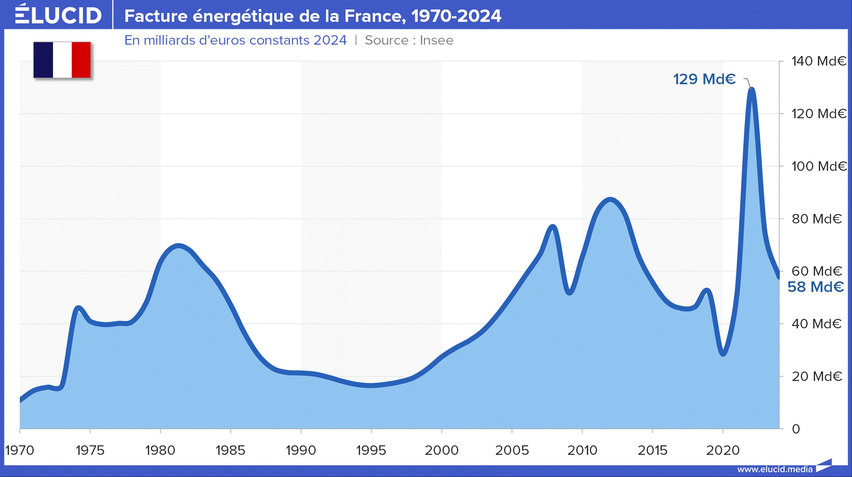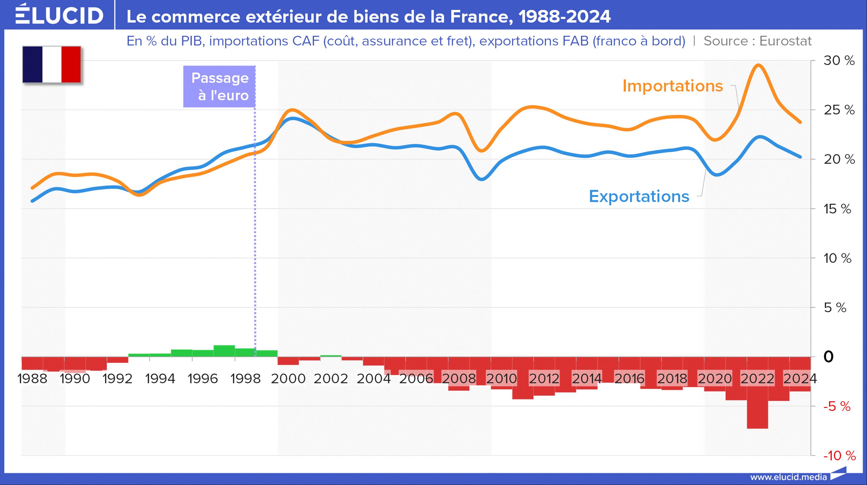 La balance commerciale française (c’est-à-dire les échanges de biens physiques) représente environ 50 % des recettes et des dépenses figurant dans la balance des paiements. En d’autres termes, le commerce de biens constitue la moitié de nos opérations économiques avec le reste du monde. En 2024, le solde de la balance commerciale s’est établi à -60 Md€ (et même à -100 Md€ si l’on exclut le négoce). Ce lourd déficit s’explique par la large désindustrialisation du pays et, plus spécifiquement en 2024, par une facture énergétique de 58 Md€ – un montant encore très élevé, mais heureusement bien inférieur à celui de 2022.