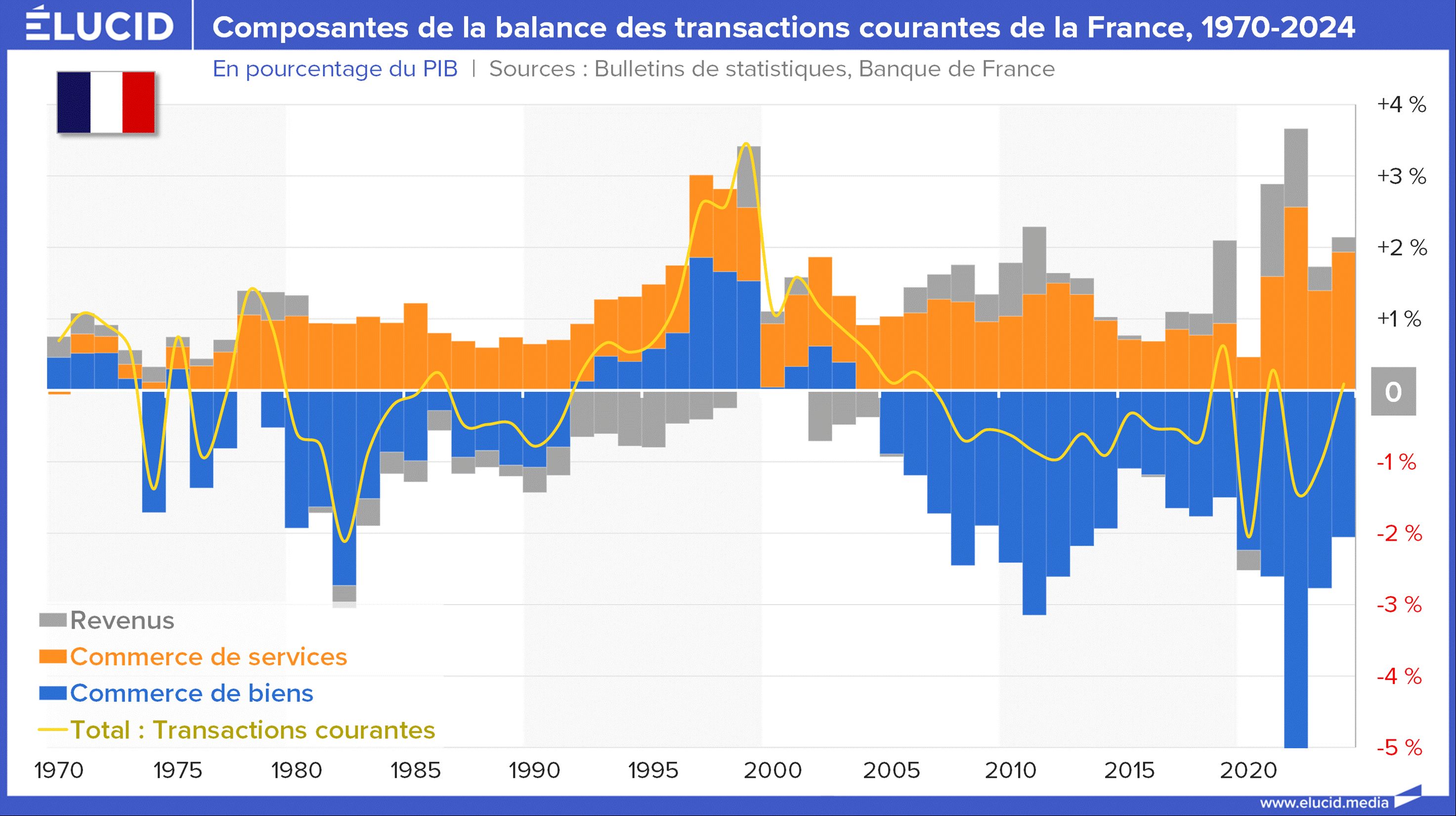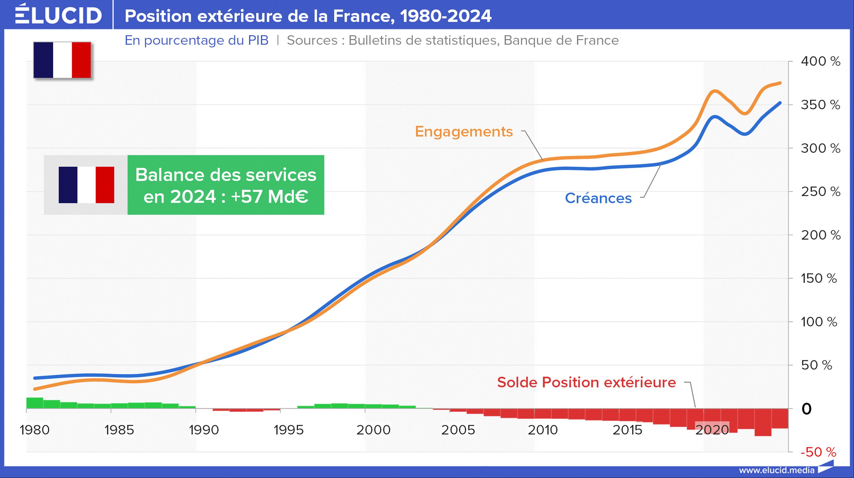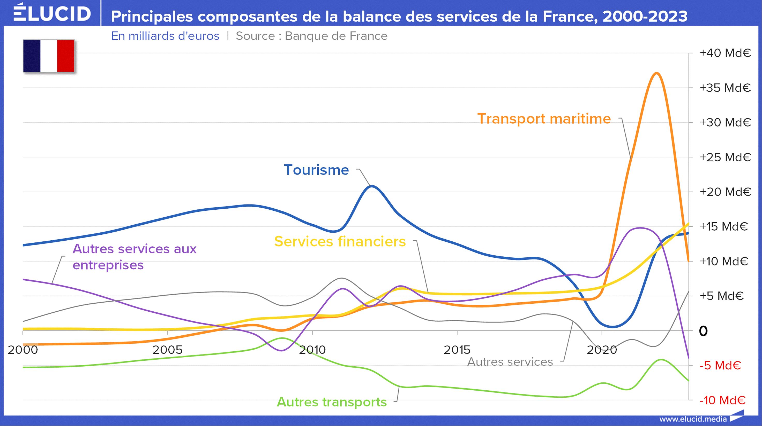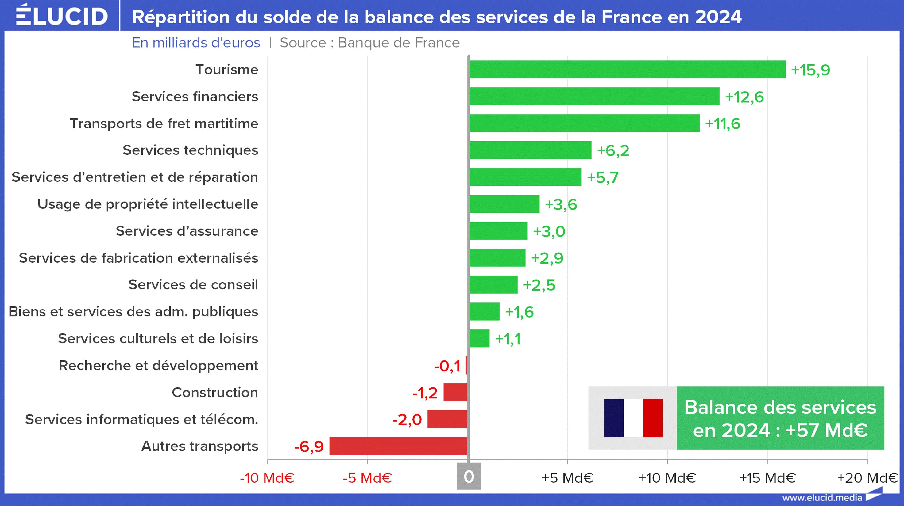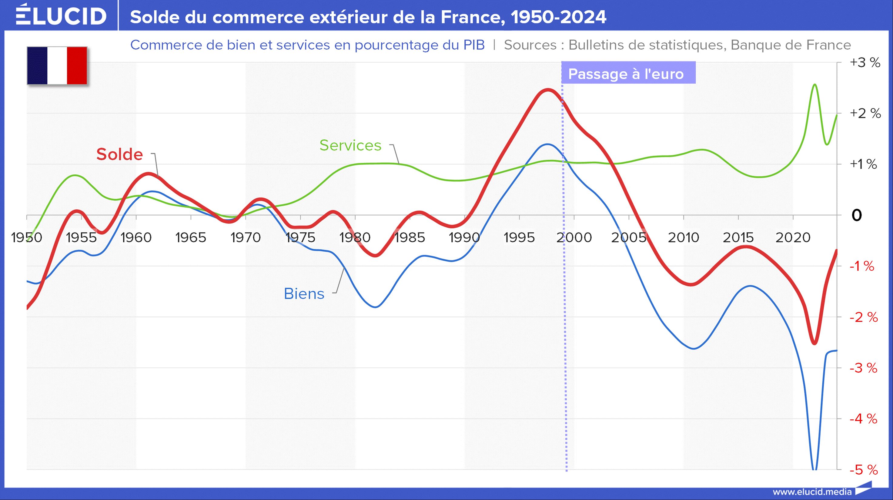 La France affiche un excédent du commerce des services depuis un demi-siècle, à hauteur d’environ 1 % du PIB en moyenne. Cet excédent a même atteint le double de ce niveau en 2022, en raison de la crise énergétique (principalement grâce au transport maritime de fret), et s’est de nouveau hissé à un niveau similaire en 2024.