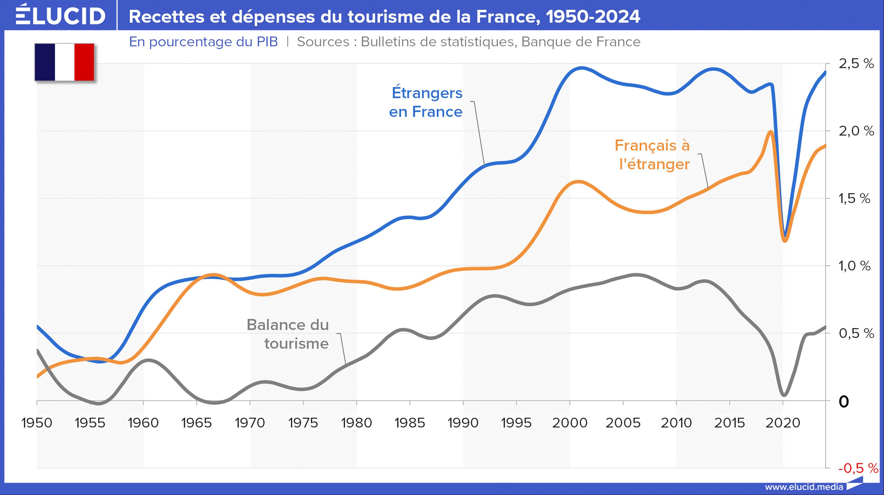 Sur le long terme, le tourisme représente environ les deux tiers de l’excédent du commerce extérieur de services français.