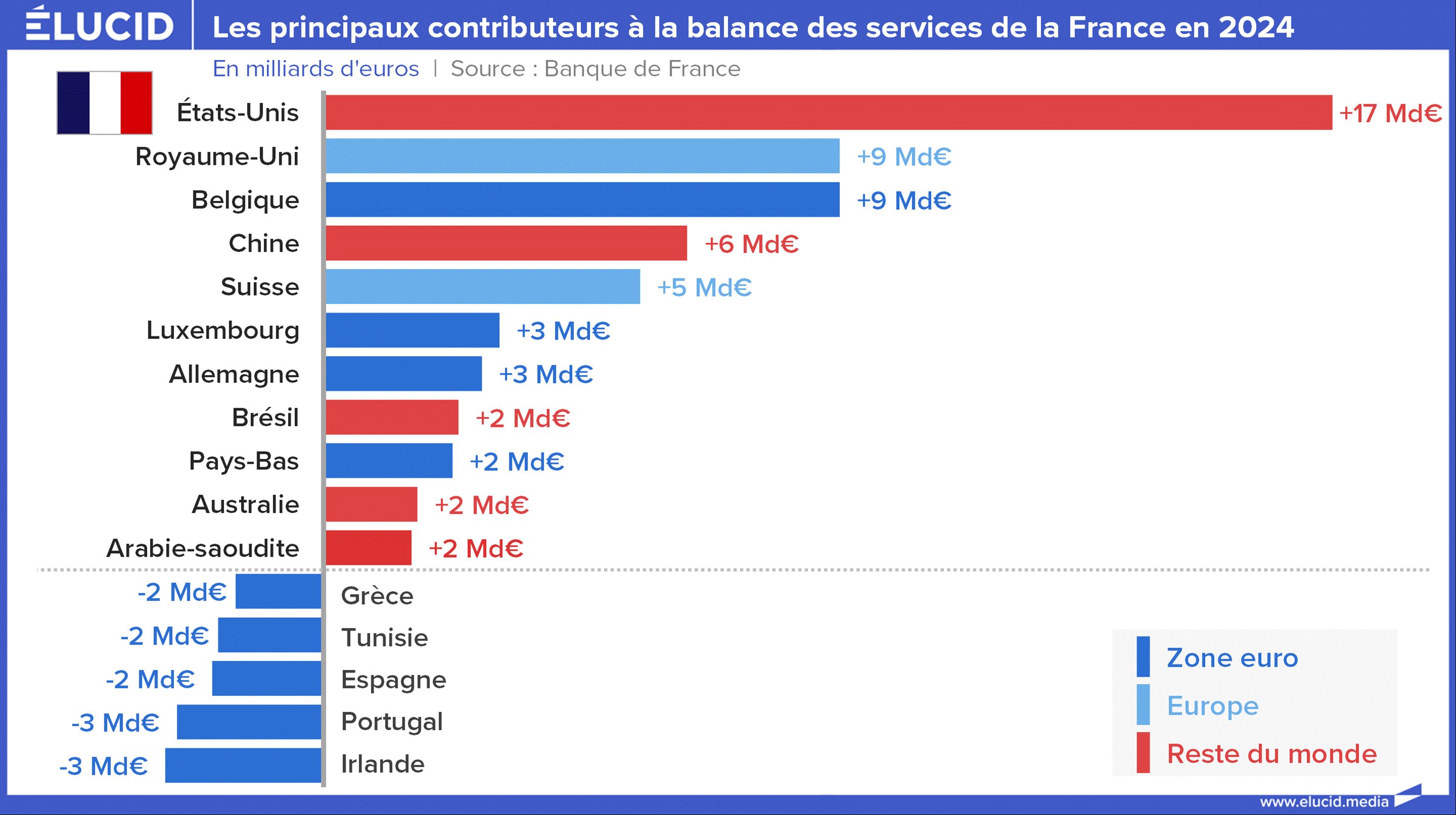 Tous services confondus, la France enregistre ces excellents résultats principalement dans ses échanges avec les États-Unis (près de 16 Md€ d’excédent), la Belgique, le Royaume-Uni, la Chine et la Suisse. En revanche, elle demeure fortement déficitaire vis-à-vis de l’Irlande, du Portugal et de l’Espagne.