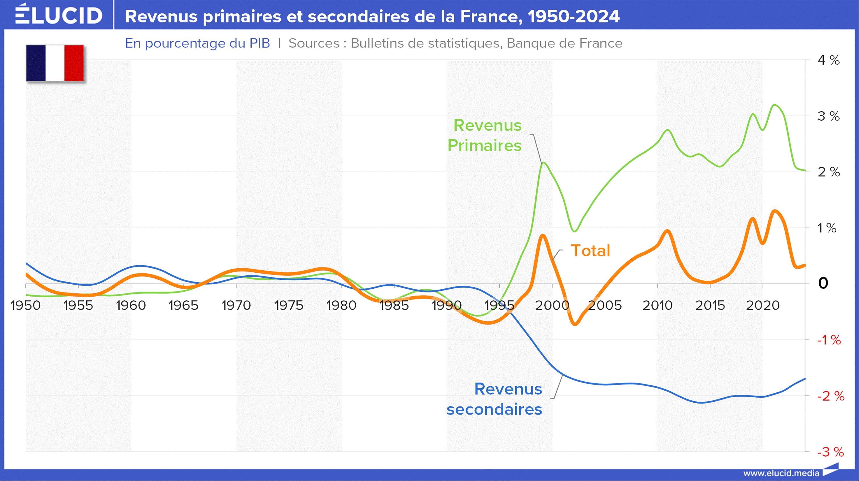 Depuis lors, le solde des revenus primaires (revenus perçus au titre du travail, du capital, etc.) a fortement augmenté, pour atteindre l’équivalent de 2 % du PIB ponctionnés sur l’étranger. L’excédent très élevé enregistré en 2024, à hauteur de 55 Md€, provient principalement de 34 Md€ de rémunérations de salariés (travailleurs frontaliers, notamment parmi les 210 000 Français travaillant en Suisse) et de 15 Md€ de revenus d’investissements perçus de l’étranger (en net, dont 76 Md€ de dividendes directs nets).