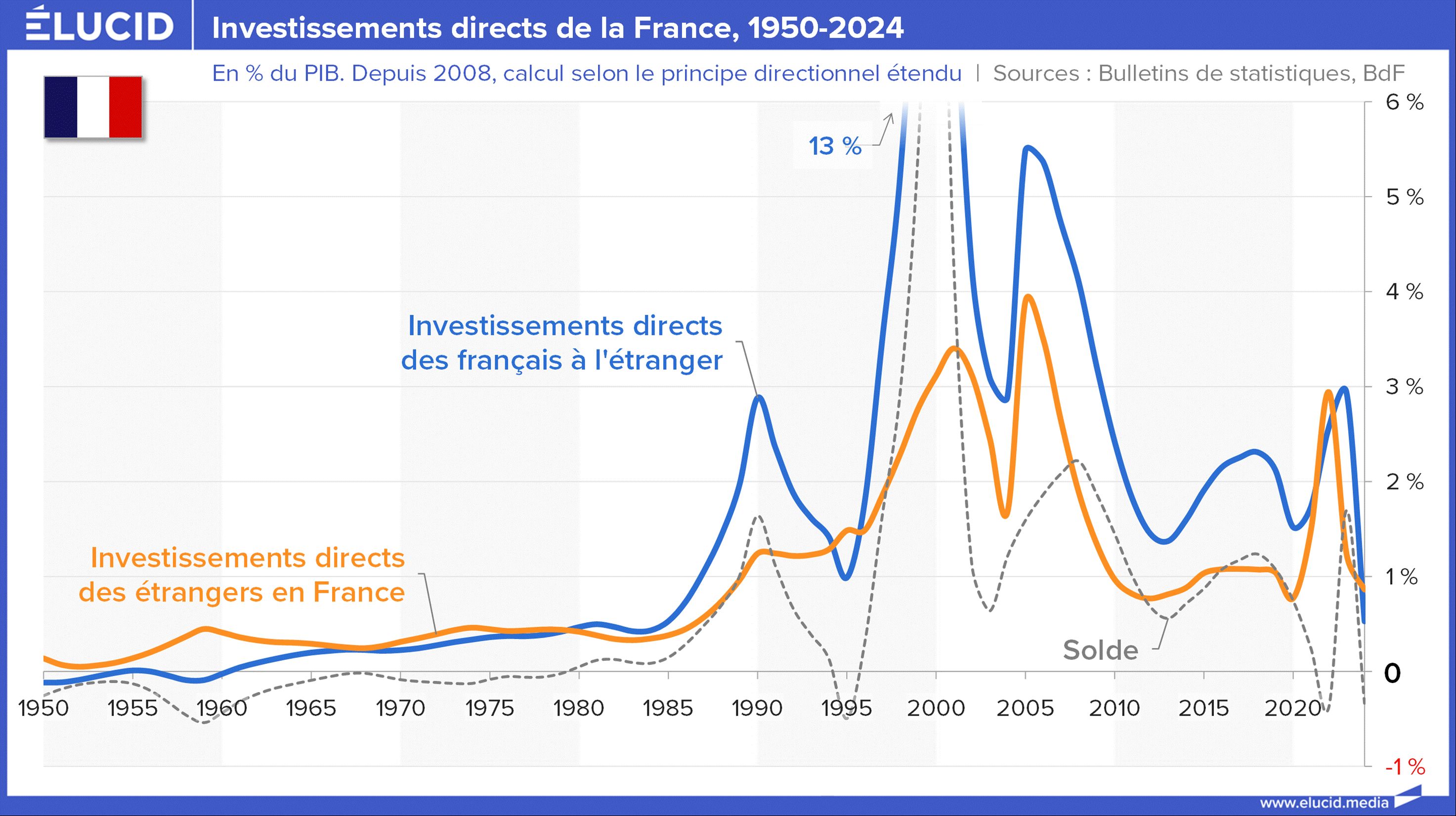 Le compte financier se décompose en cinq éléments. Le premier est celui des investissements directs, c’est-à-dire, pour simplifier, les opérations d’achat ou de vente de plus de 10 % du capital d’une entreprise. La valeur nette de -10 Md€ observée en 2024 indique que les Français ont racheté moins d’entreprises étrangères que les étrangers n’ont acquis d’entreprises françaises. C’est négatif en soi, mais cela constitue malgré tout une entrée de capitaux qui atténue d’autant le besoin de financement du pays. Ce résultat constitue un léger revirement, car cela faisait un demi-siècle que la France enregistrait généralement un excédent d’investissements directs (un record ayant été atteint lors de la bulle Internet de 2000).