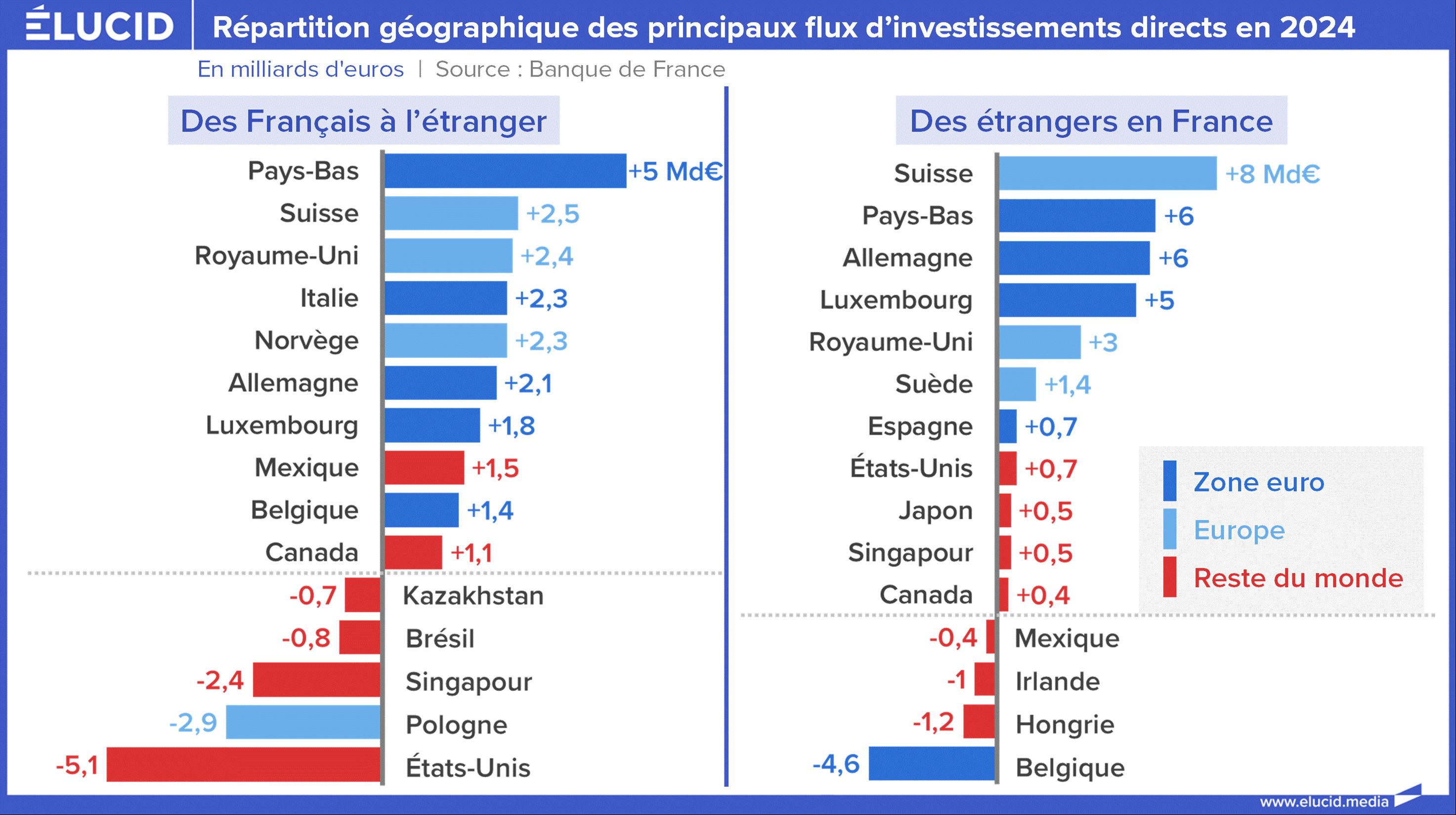 Du côté des investissements étrangers en France, la Suisse, les Pays-Bas, l’Allemagne, le Luxembourg et le Royaume-Uni occupent les premières places, tandis que les investisseurs belges ont rapatrié 5 Md€ investis en France.