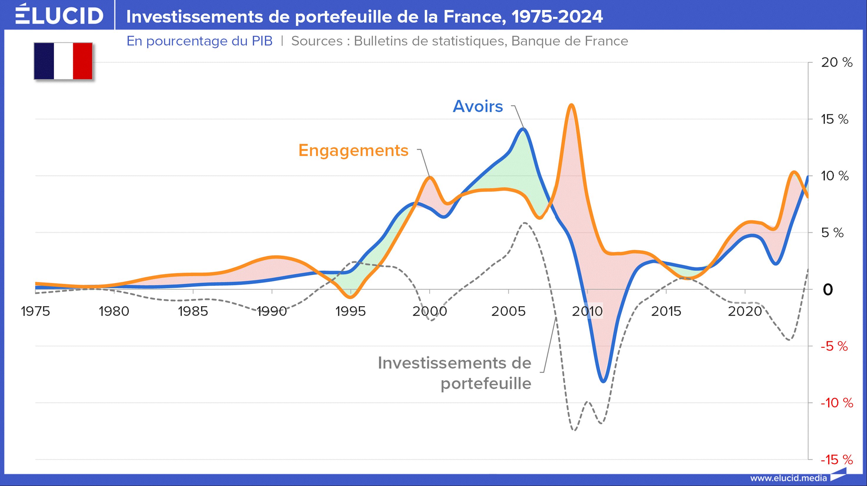Sur le long terme, on observe bel et bien une explosion de ces flux d’investissements de portefeuille à partir du milieu des années 1990, parallèlement à la mondialisation financière. Ils ont largement financé les besoins gigantesques apparus lors de la crise de 2008 et, plus récemment, de celle de 2022. La forte hausse de ces investissements en 2024 s’explique par d’importants achats d’actions américaines (+80 Md€ en un an), ainsi que par des acquisitions de titres belges et luxembourgeois.