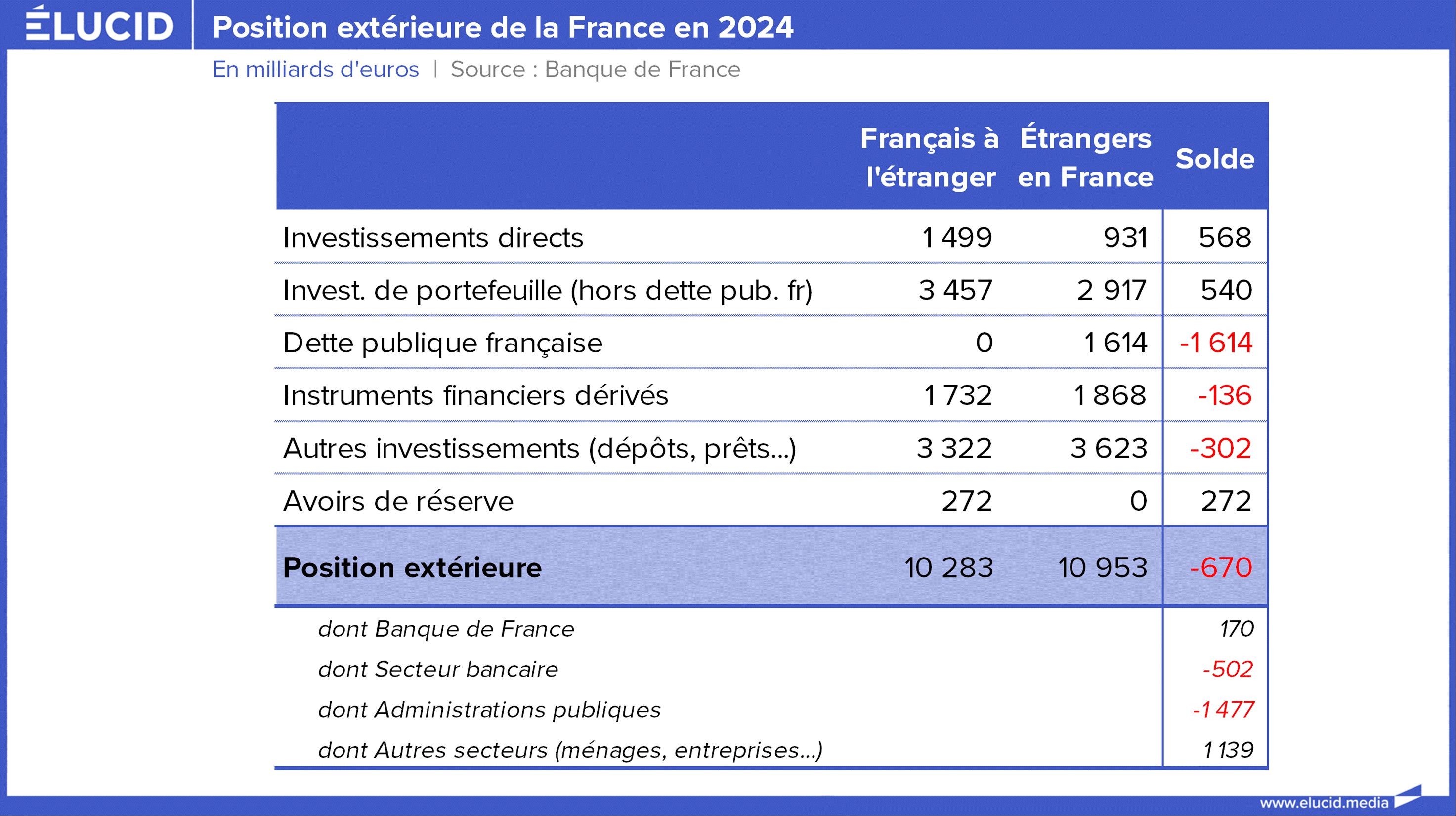 La balance des paiements mesure donc les différents flux transfrontaliers sur une année donnée, en particulier les flux du compte financier. Ce dernier (le compte financier, purement flux) est complété par un état appelé « position extérieure », qui représente le stock total d’avoirs financiers détenus par les Français à l’étranger et par les étrangers en France. En 2023, cette position extérieure de la France présente un déficit de 670 Md€ : c’est le montant net qu’ont investi les étrangers en France au total.