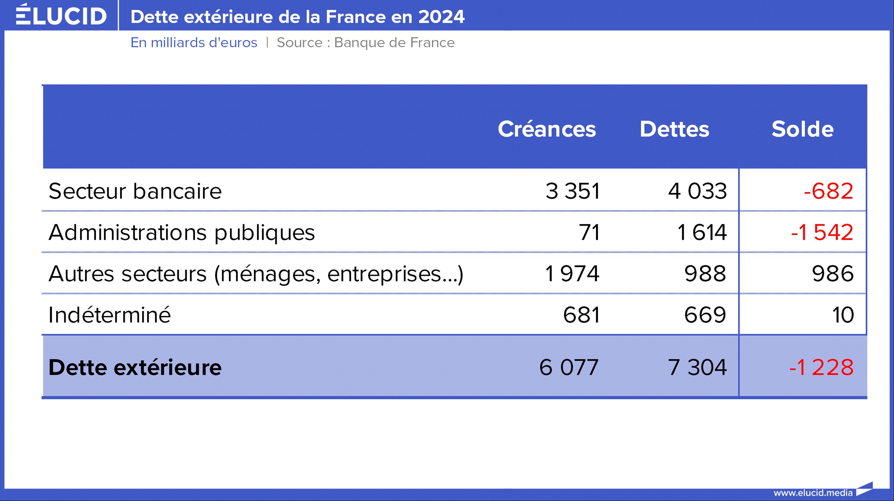 C’est un solde net, c’est-à-dire la différence entre les prêts accordés et les prêts souscrits. La dette extérieure brute – la somme totale des emprunts contractés par des résidents français auprès de non-résidents – est de l’ordre de 6 900 Md€.