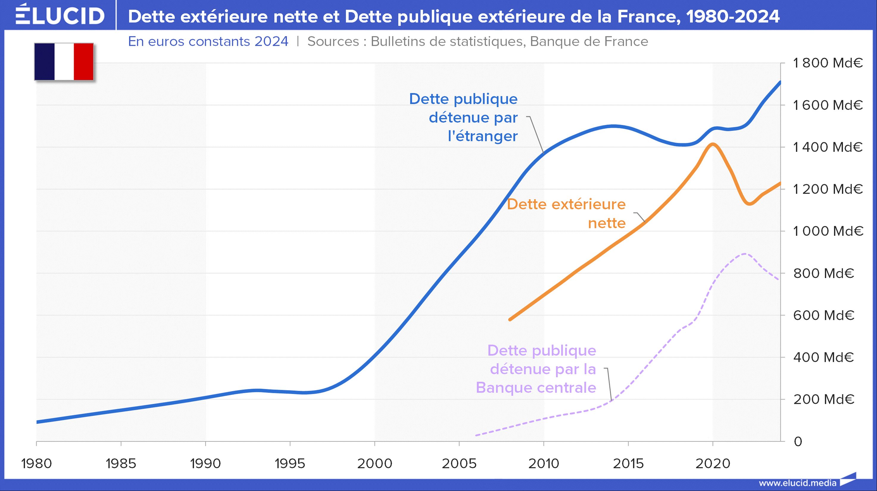 La position extérieure de la France est évidemment lourdement plombée par la dette publique, dont 1 600 Md€ sont désormais détenus par des créanciers étrangers.