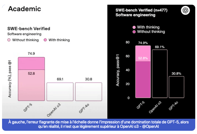 Le graphique ci-dessous (à gauche) diffusé par OpenAI circule notamment sur les réseaux sociaux. Il est censé représenter les progrès réalisés depuis les versions antérieures. Problème : les proportions ne sont pas du tout respectées. Ce qui pourrait sembler anodin révèle un problème très sérieux pour OpenAI : le nouveau modèle produit les mêmes erreurs qu’avant ; il n’est donc toujours pas fiable.