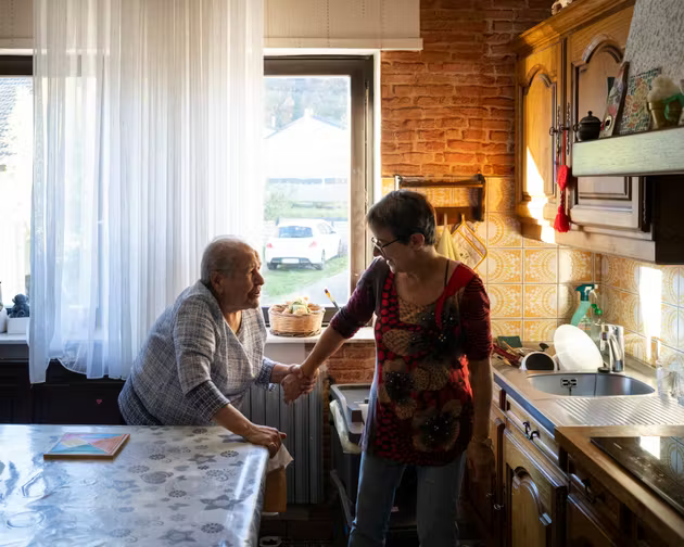 Angèle Midenet, 61 ans, retraitée, vit à quelques mètres de la maison de sa mère, Virginia, 91 ans, à Stiring-Wendel (Moselle). La nonagénaire est atteinte de troubles apparentés à la maladie d’Alzheimer. Ici, le 5 novembre 2025. NICOLAS LEBLANC POUR « LE MONDE »