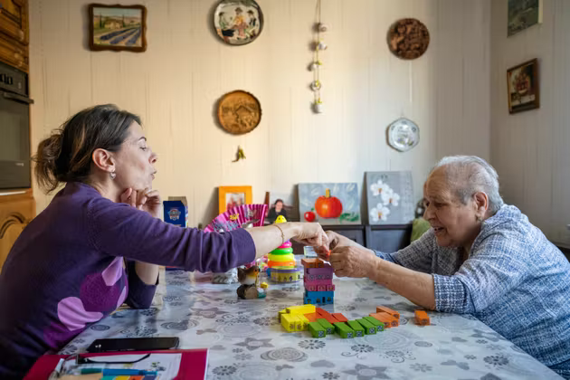 Chaque jour, à 14 heures, Virginia, 91 ans, reçoit chez elle Mirella, aide à domicile. Ensemble, elles réalisent des exercices visant à faire travailler sa mémoire et ses réflexes cérébraux, mis à mal par la maladie. NICOLAS LEBLANC POUR « LE MONDE »