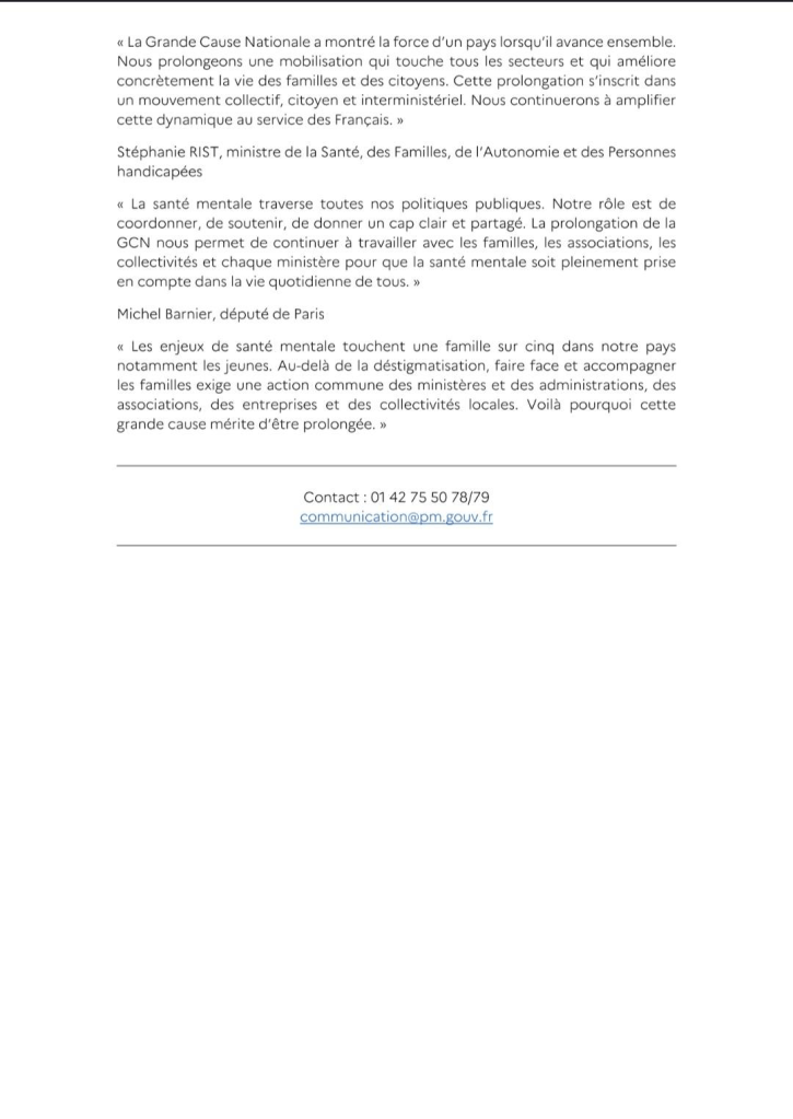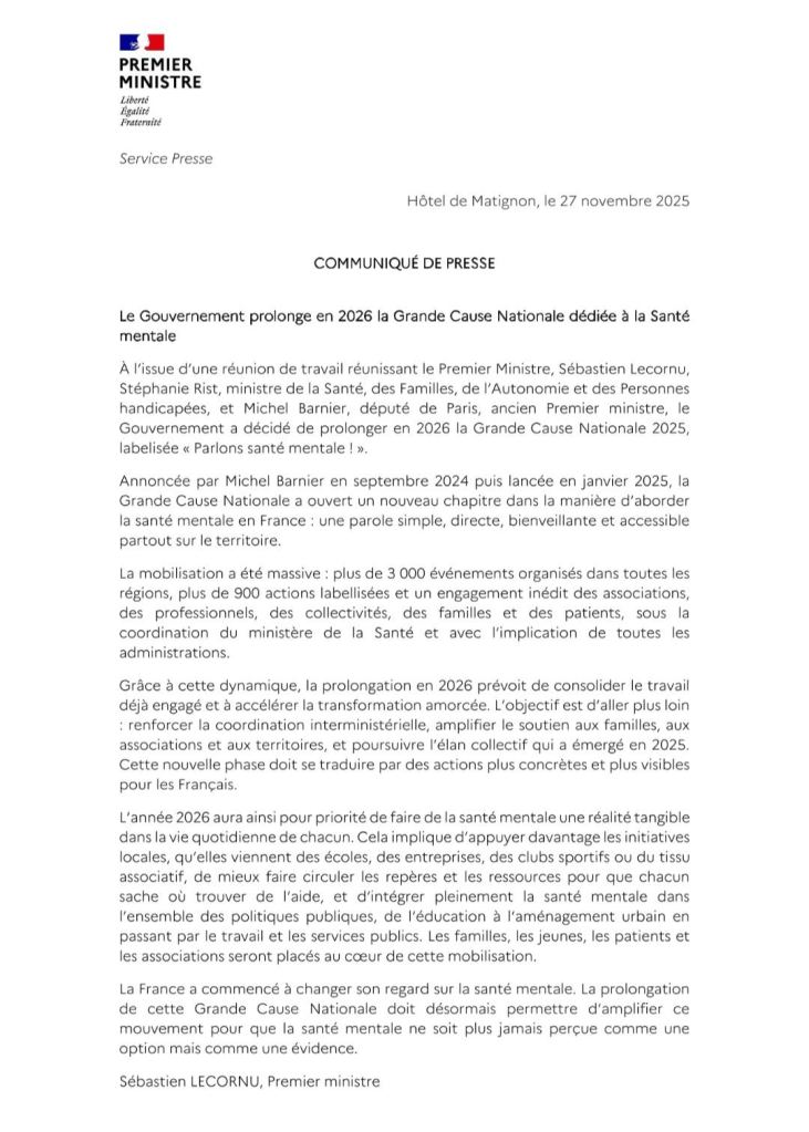 À l’issue d’une réunion de travail réunissant Sébastien Lecornu, Stéphanie Rist et Michel Barnier, député de Paris et ancien Premier ministre, le Gouvernement a donc décidé de prolonger en 2026 la grande cause nationale de 2025, dédiée à la santé mentale.