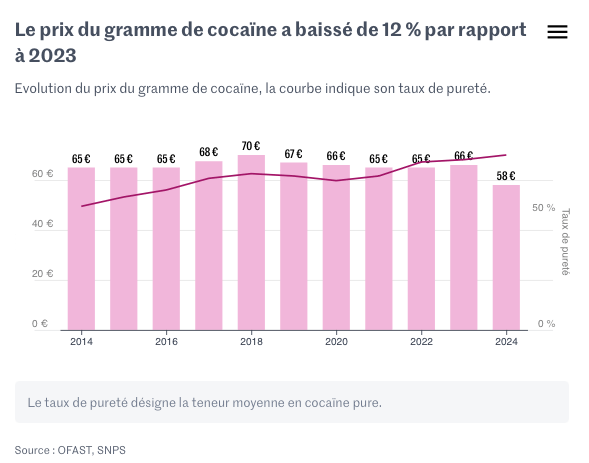 Alors que le prix moyen du gramme de cocaïne oscillait entre 65 et 70 euros depuis 2014, il est tombé à 58 euros en 2024. « Pour la première fois, on est passé en dessous de la barre symbolique des 60 euros, même si de fortes variations persistent entre les régions », relève Ivana Obradovic.