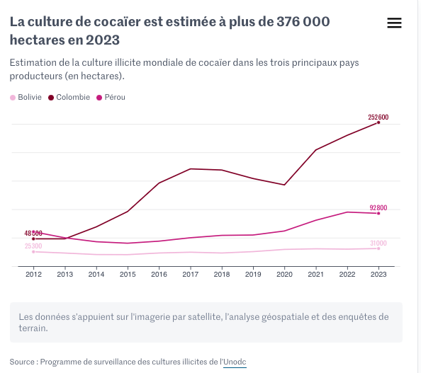 La production mondiale de cocaïne était estimée par l’Ofast à 4 000 tonnes en 2024, soit deux fois plus qu’en 2020. Ivana Obradovic, directrice adjointe de l’OFDT, explique cette hausse par « l’augmentation des surfaces de culture et des rendements » des trois principaux pays producteurs de feuilles de coca, le Pérou, la Bolivie et la Colombie. Rien que dans ce dernier pays, la production a augmenté de 53 %. En parallèle, « le cercle des pays producteurs s’est élargi » avec des pays proches comme « le Honduras, le Venezuela, l’Equateur, le Guatemala, le Mexique ou le Panama », poursuit-elle.
