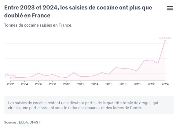 Pas moins de 1,1 million de Français ont en effet pris au moins une fois de la cocaïne en 2023, soit quasiment deux fois plus qu’en 2017, selon une enquête de l’Observatoire français des drogues et des tendances addictives (OFDT). Cette augmentation se ressent également au travers des quantités de cocaïne interceptées par les autorités, qui ont battu un nouveau record en 2024, avec 53,5 tonnes, selon l’Office antistupéfiants (Ofast). Et la tendance se poursuit en 2025, avec déjà plus de 29 tonnes de poudre blanche saisies sur les quatre premiers mois de l’année, soit deux fois plus que sur la même période l’année dernière.