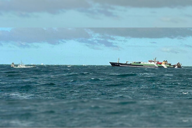 La photo circulant sur les réseaux sociaux des pêcheurs, d’un bateau d’une vingtaine de mètres face au « Maartje Theadora ». © Photo DR