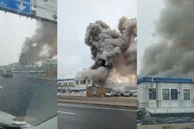 Captures d’écran de vidéos diffusées sur TF1 et BFMTV, de l’explosion d’un site SEVESO, à Saint-Fons près de Lyon, le 22 décembre 2025. © Photomontage Mediapart