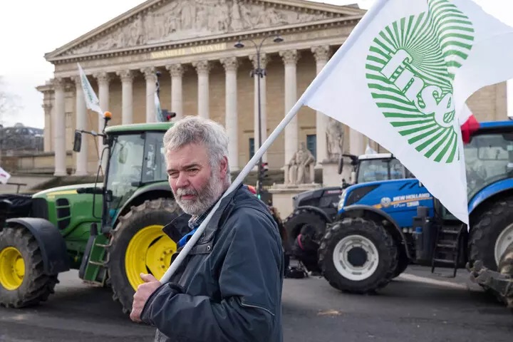 Des agriculteurs de la FNSEA et des Jeunes agriculteurs se sont rassemblés devant l’Assemblée nationale contre l’accord UE-Mercosur et la lenteur de l’application de la loi Duplomb, le 13 janvier 2026. – © Eric Broncard / Hans Lucas / Hans Lucas via AFP