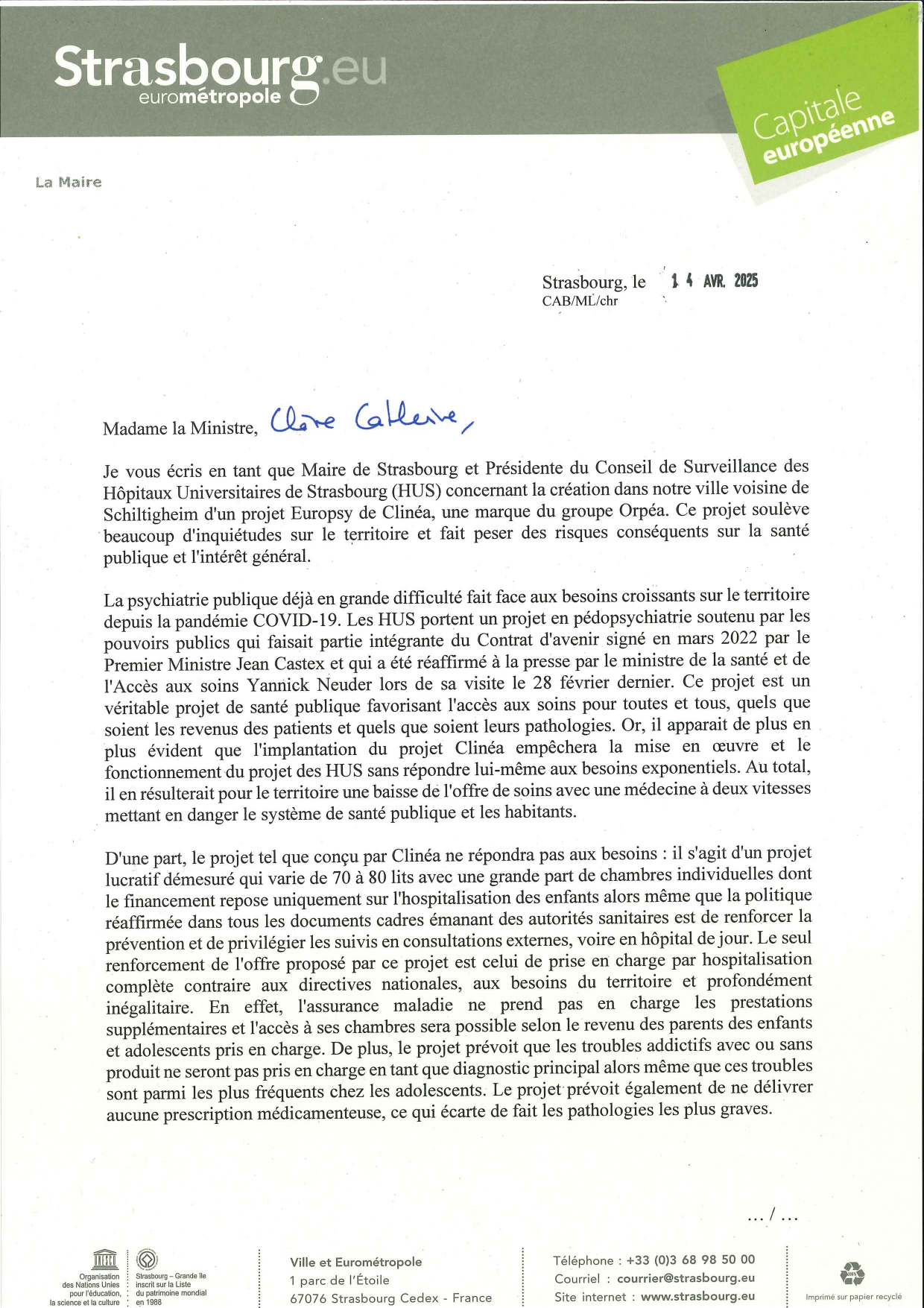 La maire de Strasbourg, Jeanne Barseghian, et ses adjoints, opposants au projet Europsy, constatent que pendant que la psychiatrie publique s’effondre, ferme lits et services et voit ses derniers pédopsychiatres partir à la retraite, l’État ouvre grand les portes au privé au lieu de soutenir le secteur en difficulté. En avril 2025, elle écrit à la ministre de la Santé de l’époque, Catherine Vautrin, pour demander le retrait de l’agrément accordé à Emeis « afin de ne pas aggraver les inégalités sociales et de santé (tous les patients ne peuvent pas se payer un séjour en clinique privée, NDLR) » et de « ne pas accroître les difficultés de l’hôpital public déjà en tension ». La ministre n’a jamais répondu. Mais la maire écologiste assure à Blast qu’elle continuera de « suivre de près le projet Emeis. » Avec l’espoir, dit-elle, « qu’il prendra meilleur soin de nos jeunes qu’Orpea ne l’a fait avec nos aînés ».